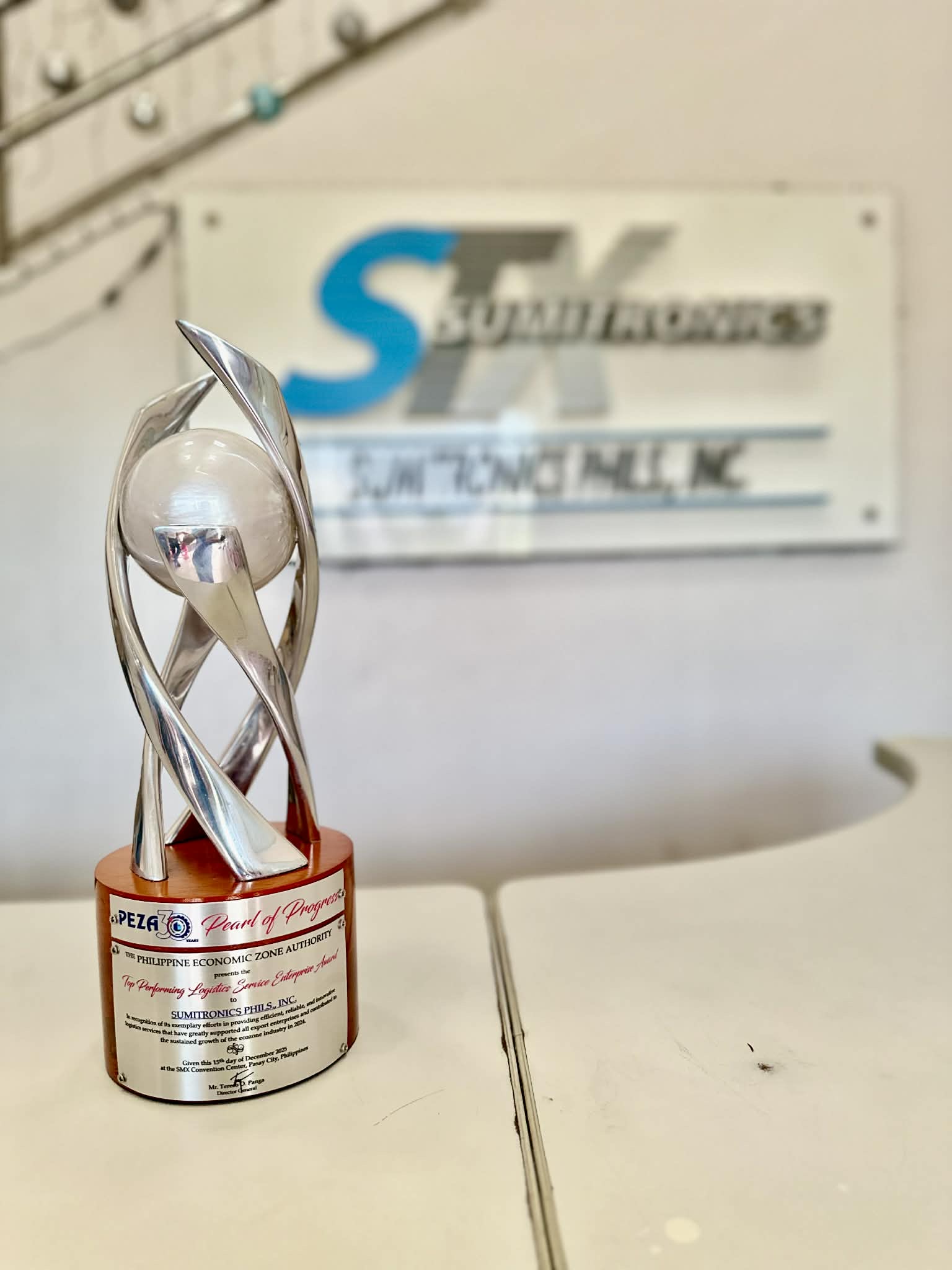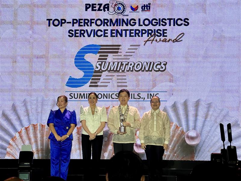 当社のフィリピン子会社であるSumitronics Phils., Inc.は、2025年12月15日に行われたフィリピン経済特区庁(PEZA)設立30周年記念式典において、PEZA登録物流企業のカテゴリーでTop Performing Logistics Service Provider Award for 2024を受賞し、Panga長官からトロフィーを授与されました。